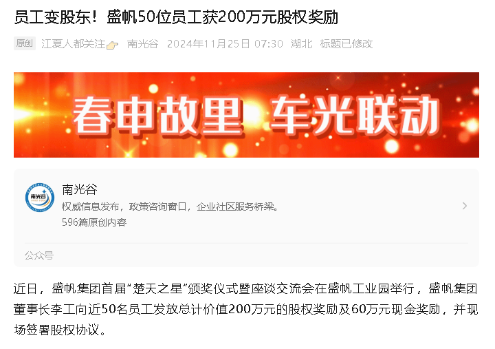 近日,盛帆集团首届“楚天之星”颁奖仪式暨座谈交流会在盛帆工业园举行,盛帆集团董事长李工向近50名员工发放总计价值20···