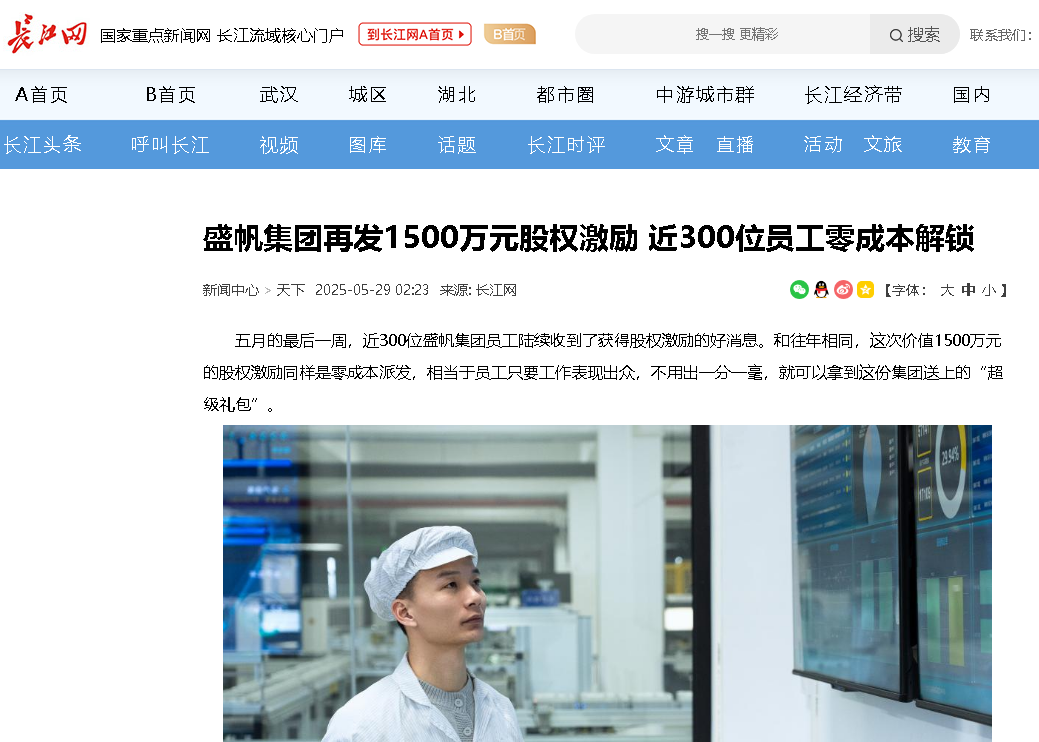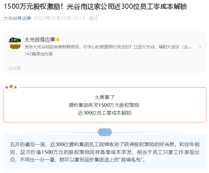 近期,武汉盛帆集团近300位员工陆续收到了获得股权激励的好消息。和往年相同,这次价值1500万元的股权激励同样是零成本派···